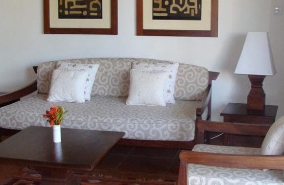 L’établissement possède 188 chambres : les standards sont réparties dans deux bâtiments et les supérieures se trouvent tout au bout de l’hôtel dans des bungalows. Les chambres disposent d’un grand lit ou de deux lits jumeaux, et possèdent toutes un balcon ou une terrasse privée. La décoration est agréable : petits cadres représentant des coquillages aux murs, les rideaux et le couvre lit sont assortis. Le plafond est orné de poutres apparentes en bois. Le sol blanc fait ressortir la lumière.