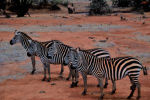Safari jusqu’à la tombée de la nuit dans le parc de Tsavo. Le parc Tsavo, plus grand parc du pays, est célèbre pour ses paysages ocres et sa faune abondante : buffles, girafes, antilopes, et surtout d’immenses troupeaux d’éléphants recouverts de la terre du parc, leur donnant cette couleur rouge si caractéristique.