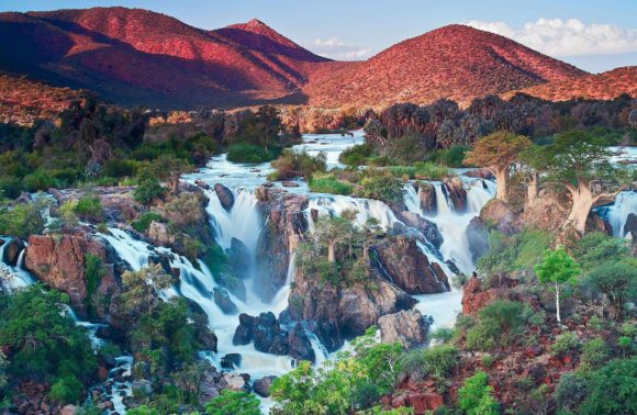 Piste vers Opuwo, la « métropole du nord » où toutes les communautés indigènes viennent faire leur marché. Continuation aux confins du pays, dans le Kaokoland, jusqu’à la rivière Kunene qui marque la frontière avec l’Angola. Le Camp Epupa est très agréable. Déjeuner. Il est situé devant la rivière et les chutes d’Epupa qui s’étalent sur 800 m, au milieu de baobabs majestueux… Ces chutes sont parmi les plus belles de la planète, grâce notamment à leur cadre sauvage, aux couleurs et à l’harmonie qui se dégage de l’ensemble du paysage. Un Must.