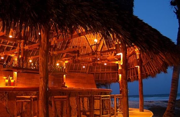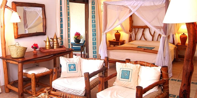 Ce petit bijou se cache à l’extrémité de la plage de Diani Beach, à l’écart des autres établissements qui se succèdent les uns derrière les autres. Une fois arrivé, le lobby de l’hôtel s’ouvre à vous : l’endroit est simplement surplombé d’un toit de makuti (grandes feuilles de palmiers). Un petit couloir où sont installées les boutiques de l’hôtel vous emmène sur une petite terrasse constituée de quelques tables, face à un beau jardin luxuriant. Tout au bout, de petits édifices où sont réunis les chambres de l’hôtel s’offrent à vous. Le tout est conçu comme un petit village.