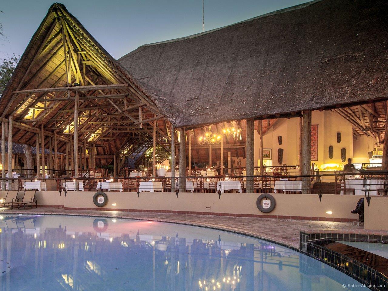 Plusieurs types de chambres : familiales avec ou sans vue sur la rivière, 2 restaurants, piscine, terrain de squash, terrain de volley ball. La situation centrale qu’occupe le lodge, à proximité de la Namibie, Zimbabwe et de la Zambie offre un choix très riche d’activités aux visiteurs : excursion pour la journée à Victoria Falls. Safari en bateau ou 4×4 dans le Parc National du Chobe