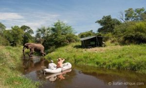 Les tentes font face a un lit de rivière. Chacune montée sur pilotis avec salle de bain et terrasse privée.