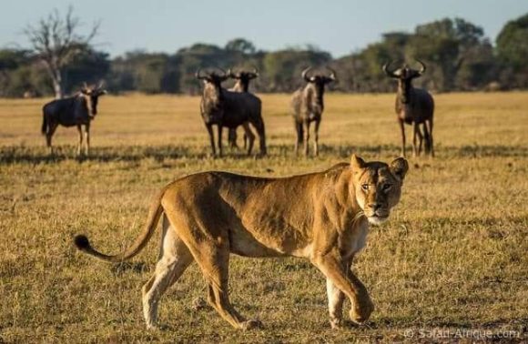 Réveil à l’aube avec le café / thé servis dans vos tentes et départ pour une première sortie en brousse pour assister au réveil de la savane. Au choix une randonnée guidée à pied ou un safari en 4×4. C’est au lever du soleil que les animaux sortent plus facilement. Vous aurez la chance de croiser des lions, guépards … et encore des zèbres, éléphants girafes … une belle première découverte du parc.